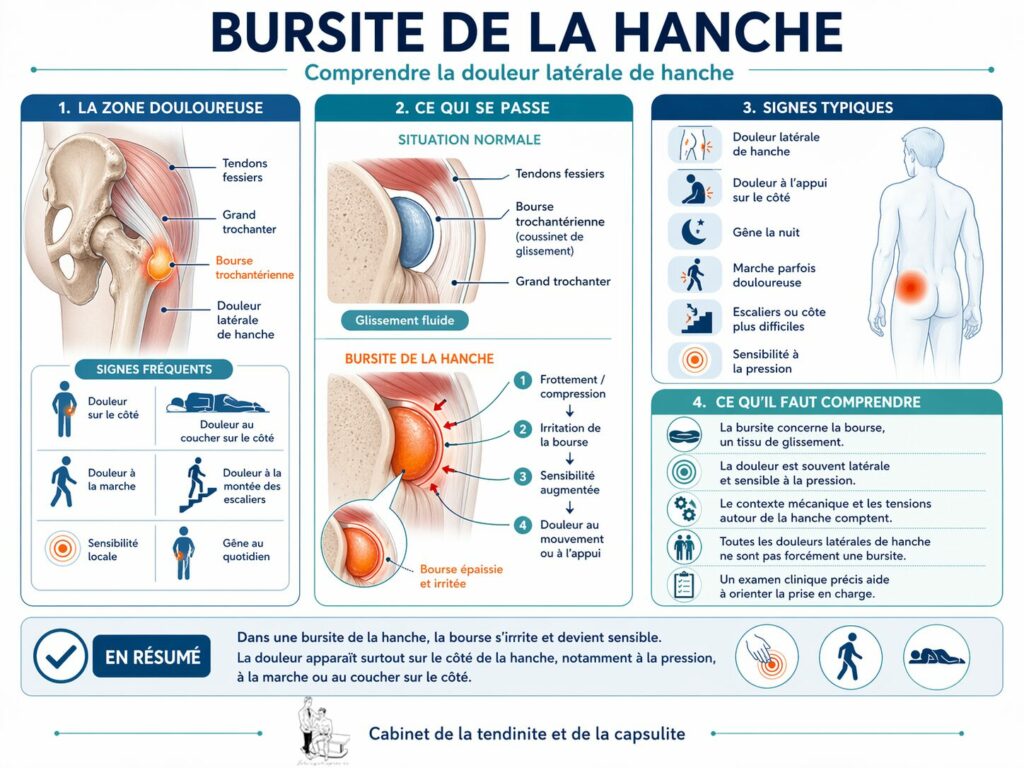 Bourse du moyen fessier — douleur face externe de la hanche, souvent confondue avec une tendinite du moyen fessier.
